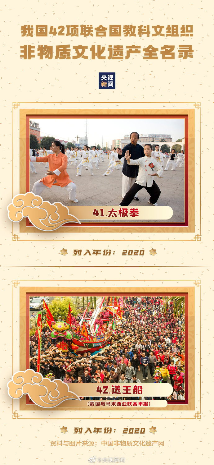 12月17日,太极拳和送王船成功申遗。此前,中国书法、二十四节气、京剧等也都列入联合国教科文组织非物质文化遗产名录(册)。我国共42个项目列入其中,居世界第一!
