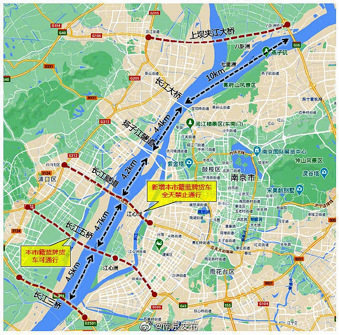 通车之日起,长江五桥全天禁止危化品运输车、非南京市籍货车、非南京市籍大客车、南京市籍中型(含)以上货车通行。上坝夹江大桥(浦仪公路)全天禁止危化品运输车、非南京市籍货车、南京市籍中型(含)以上货车通行。应天大街隧道(长江隧道)调整为全天禁止所有货车通行。长江大桥、扬子江隧道原通行政策不变。(总台央视记者 吴睿)