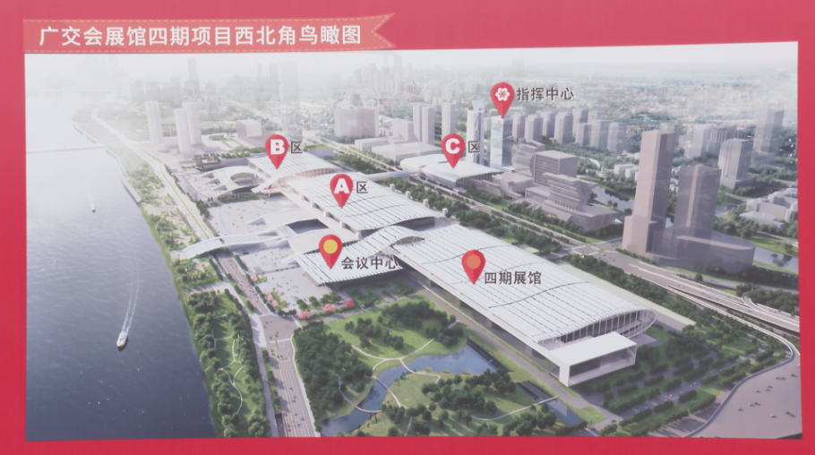 广交会展馆四期扩建项目位于原展馆A区西侧和C区西南角,由新建的两层展馆、4万平方米的会议中心和9万平方米的广交会指挥中心三部分组成。总投资54亿元,总建筑面积约51.5万平方米,建成后将新增展位5000个,配套会议、培训、办公等功能,展馆硬件可满足各类大型机械展的使用要求。其中展馆和会议中心预计将于2022年秋交会投入使用。