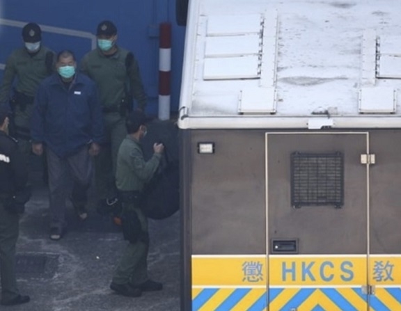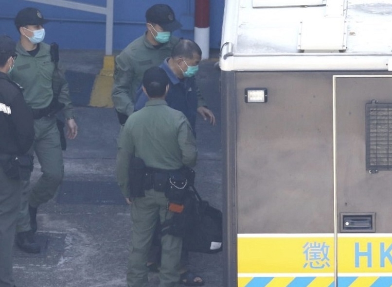 18日早11时许,黎智英身穿蓝灰色囚衣及拖鞋,在惩教署押解支援组人员押解下,双手戴手铐被押上囚车前往赤柱监狱继续关押。