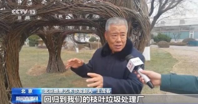 北京地景艺术节发起人 王茂春:这些材料都是用梨树枝、海棠树枝、苹果树枝等等(做成的)。我们在这里边种上各种各样的藤蔓植物、爬藤植物,明年春天开得五颜六色。让游客到这里以后可以尽情休闲、乘凉 。经过一年的时间,把所有树枝回归到我们的枝叶垃圾处理厂, 然后经过加工处理变成肥料,变成有机的基质,再回归到土地上,种花、 种树、种草。
