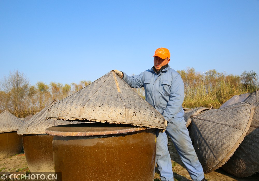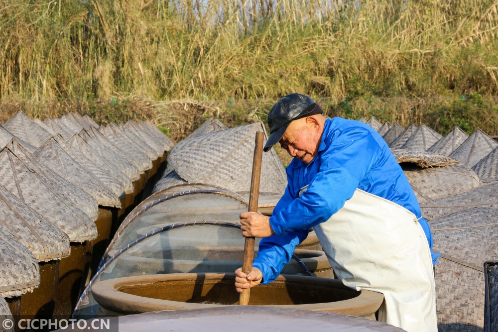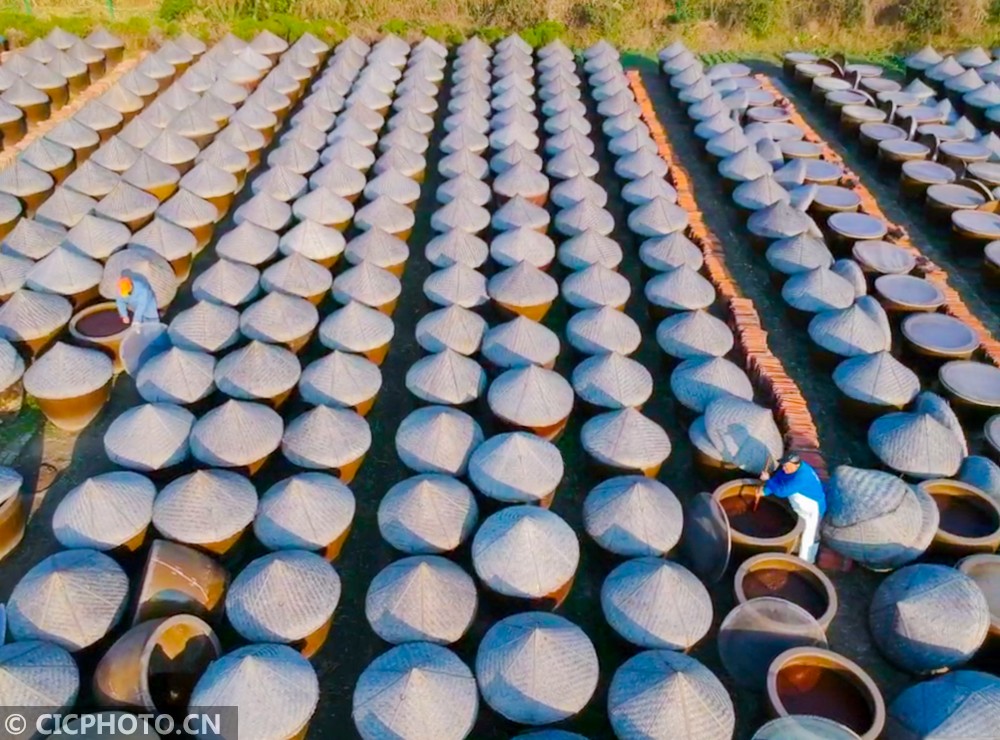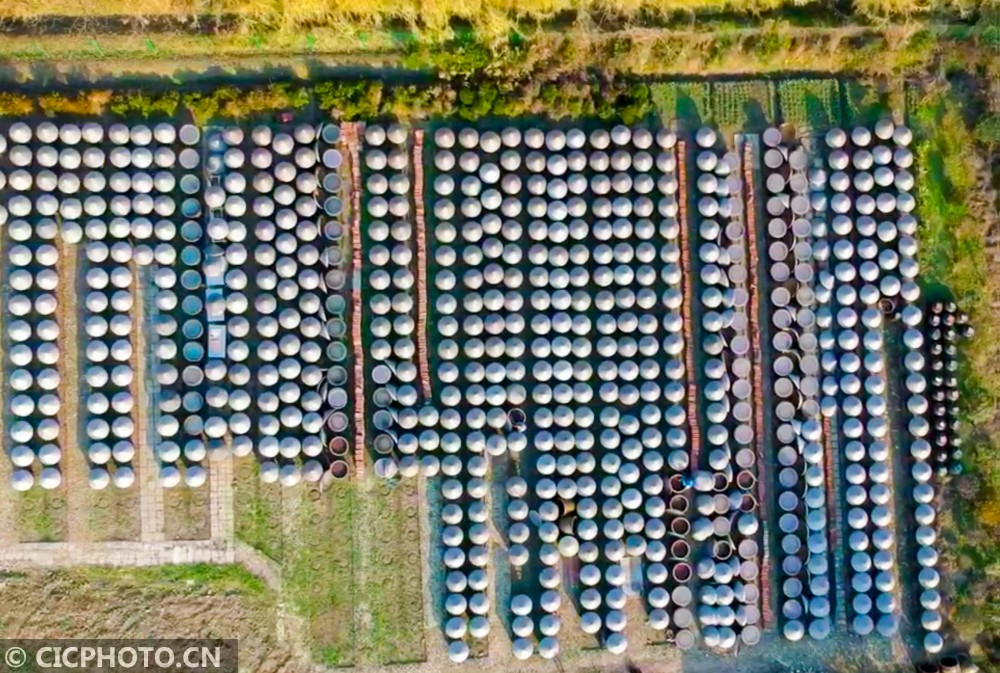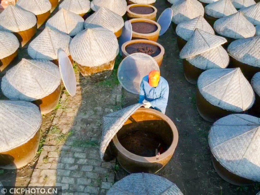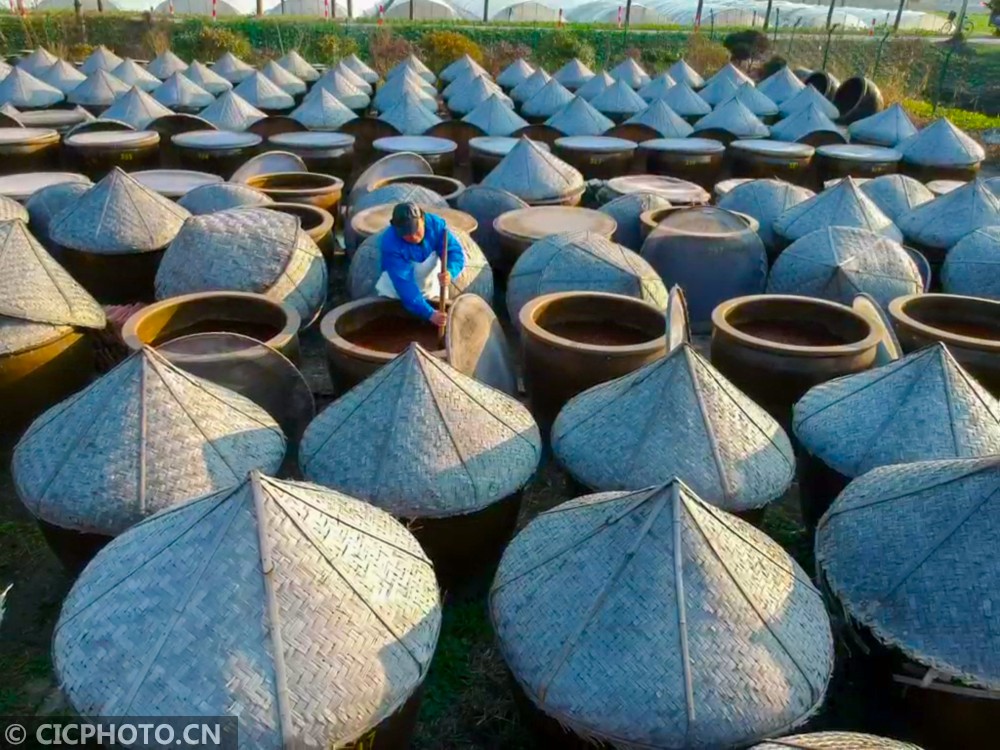 2020年12月17日,在江苏省如皋市如城街道沿河村老酱油露天晒场上,1000余只大缸慵懒地享受着阳光,工人们正在老酱油晒缸前忙着翻酱。眼下正值老酱油冬酿时节,如皋老酱油采用的酿造工艺沿袭了上千年,2017年被列入南通市级非遗名录。
