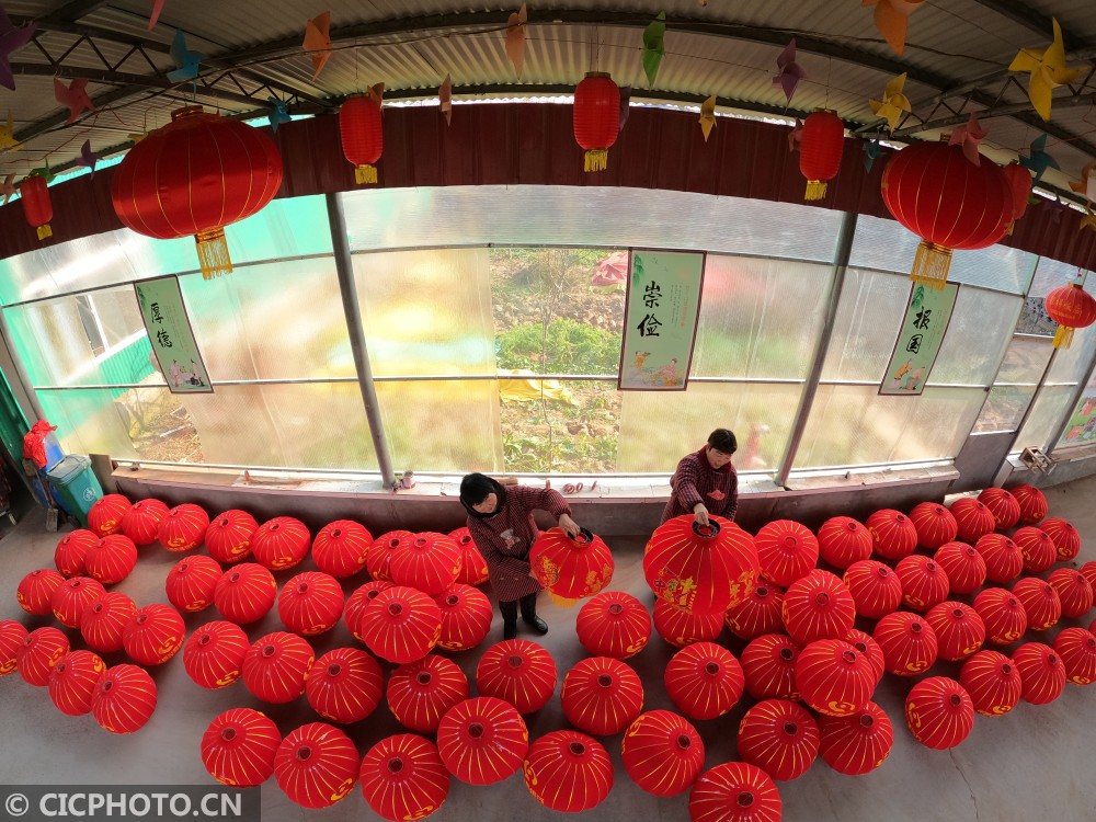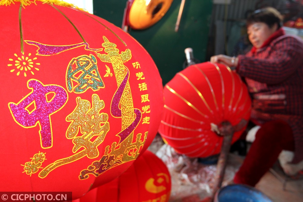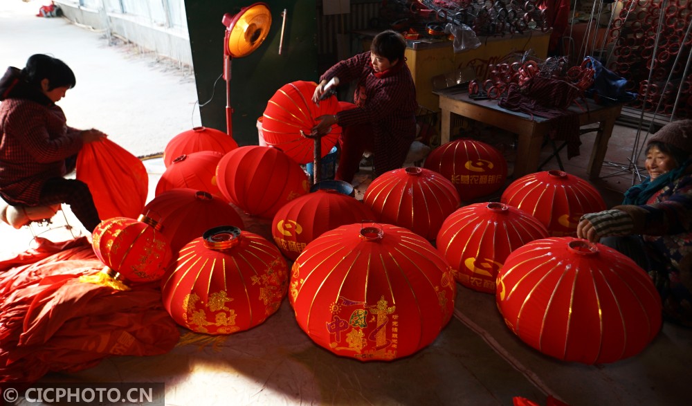 ↑2020年12月16日,村民在河南省长葛市古桥镇本庄村灯笼加工厂制作灯笼。CICPHOTO/牛书培 摄
