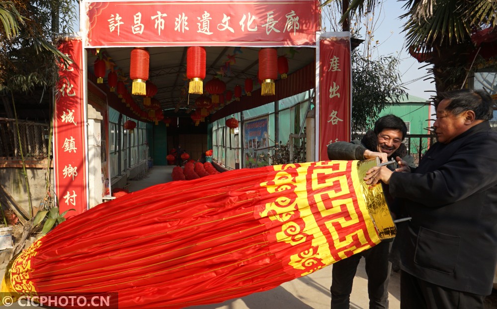 ↑2020年12月16日,在河南省长葛市古桥镇本庄村灯笼加工厂,许昌市传统灯笼制作技艺传承人(右)和工人一起整理准备外销的特大型灯笼。CICPHOTO/牛书培 摄