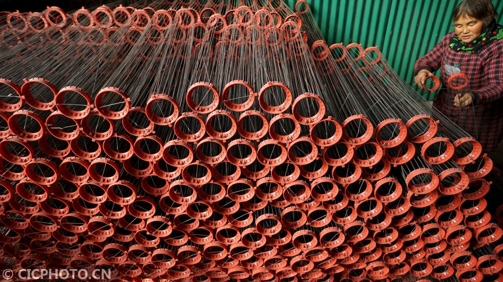 ↑2020年12月16日,村民在河南省长葛市古桥镇本庄村灯笼加工厂整理制作灯笼的骨架。CICPHOTO/牛书培 摄