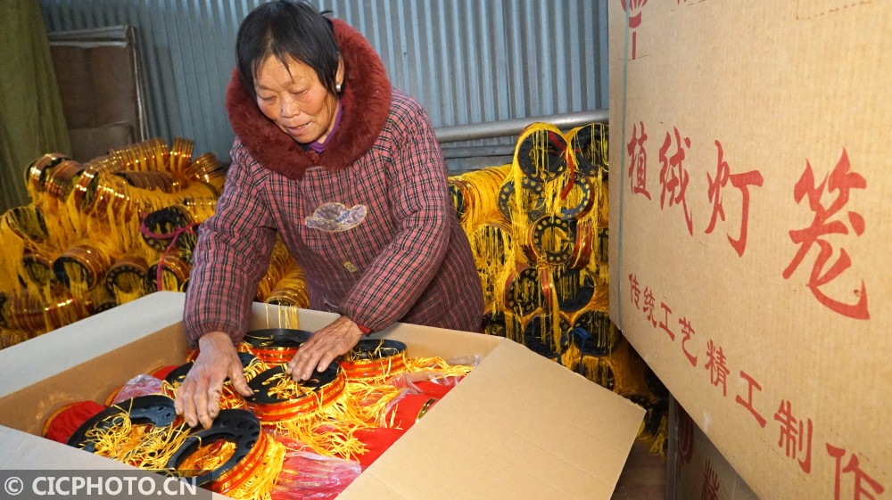 ↑2020年12月16日,村民在河南省长葛市古桥镇本庄村灯笼加工厂将准备外销的灯笼装箱。CICPHOTO/牛书培 摄