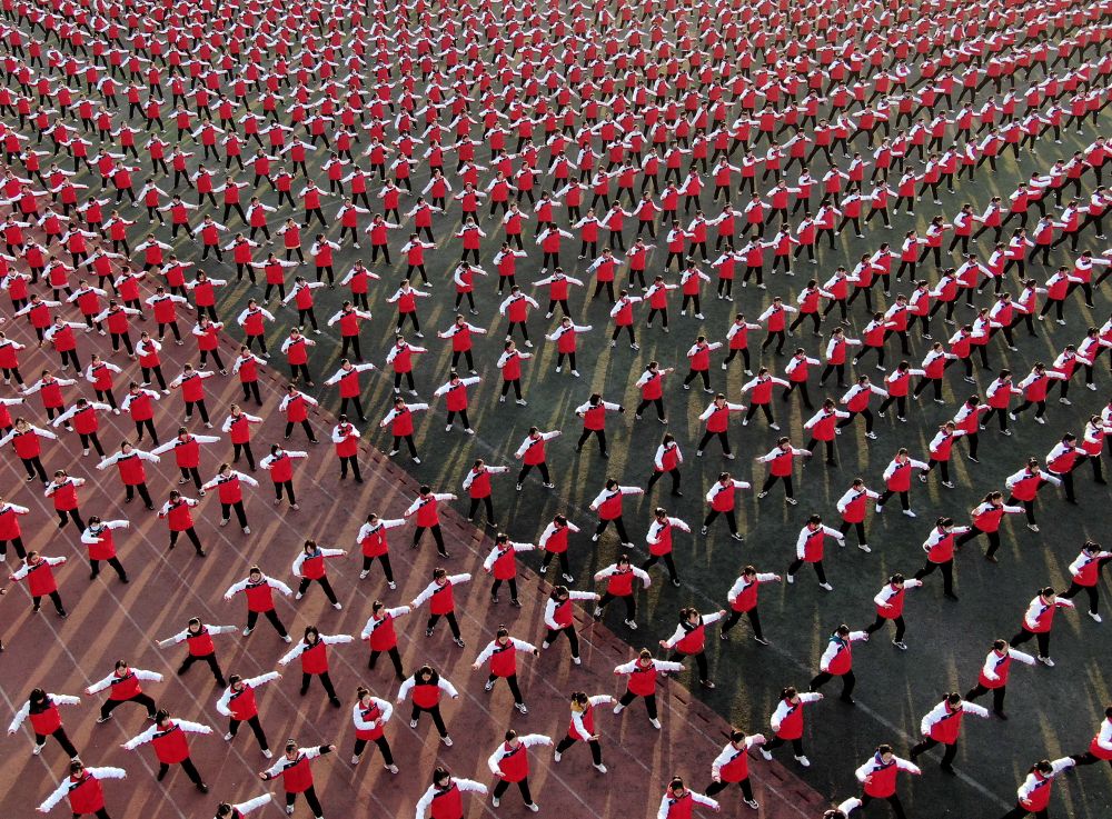 河南省焦作市温县第一高级中学的学生在操场上练拳。新华社记者李安摄