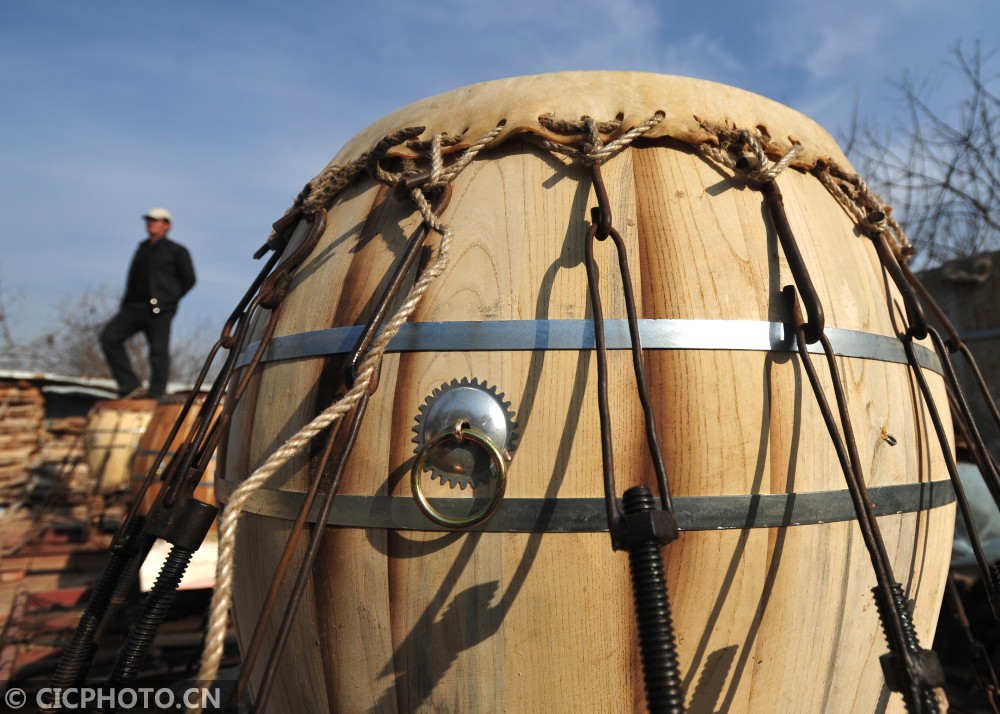 ↑2020年12月17日,河北省泊头市齐桥镇东毛三庄村,制鼓艺人张福存在检验大鼓音质。CICPHOTO/苑立伟 摄