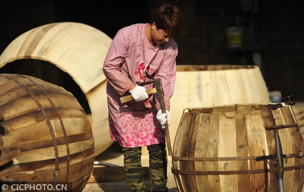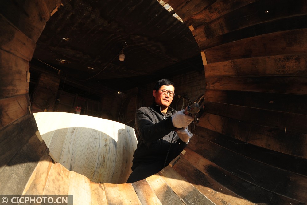 ↑2020年12月17日,河北省泊头市齐桥镇东毛三庄村,制鼓艺人毛林知在制作鼓腔。CICPHOTO/苑立伟 摄