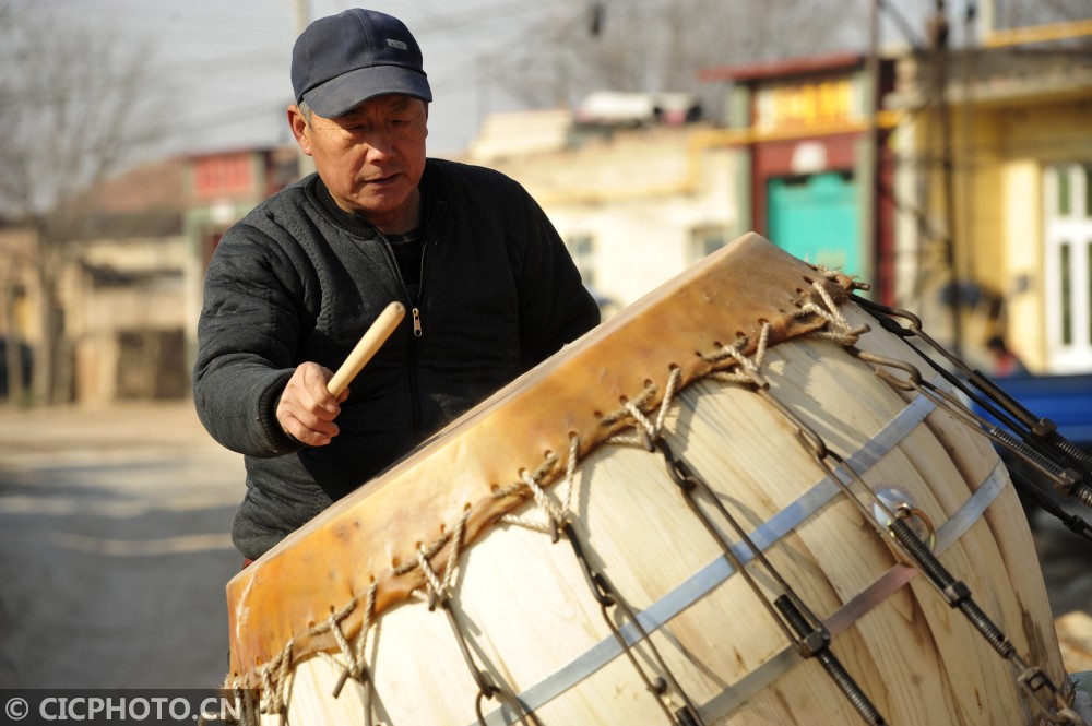 ↑2020年12月17日,河北省泊头市齐桥镇东毛三庄村,制鼓艺人在踩鼓。CICPHOTO/苑立伟 摄