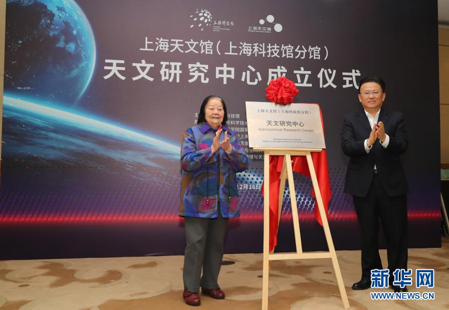 12月18日,叶叔华院士(左)在成立仪式上为天文研究中心揭牌。