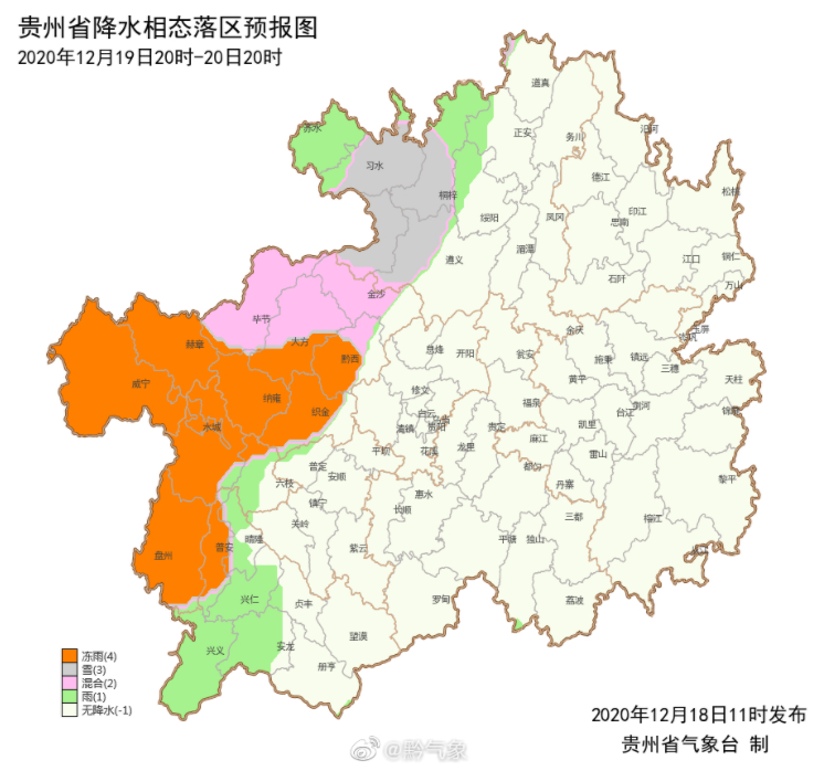 19日夜间到20日白天,贵州省的西部地区阴天夜间有零星冻雨或雨夹雪,其余地区阴天转多云到晴,贵州省的东北部地区夜间到早晨局地有霜,全省大部气温略有回升。