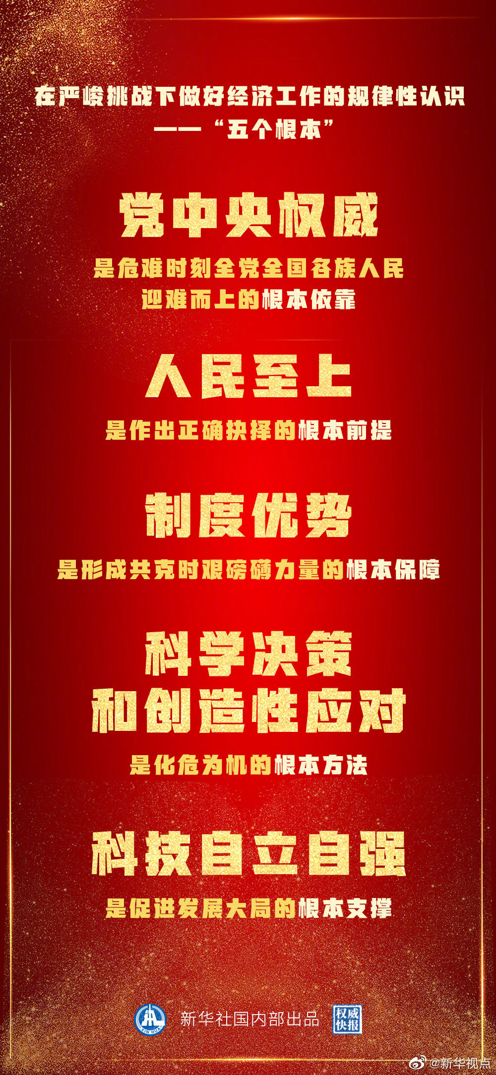 【权威快报|2020中国答卷的五个根本】极不平凡的2020年,中国交出一份人民满意、世界瞩目、可以载入史册的答卷。来之不易的成绩背后有何“成功秘诀”?中央经济工作会议强调,在统筹国内国际两个大局、统筹疫情防控和经济社会发展的实践中,我们深化了对在严峻挑战下做好经济工作的规律性认识。会议提出的这“五个根本”经验,内涵深刻、启迪未来。(邹多为、刘文昕海报设计:苗夏阳)