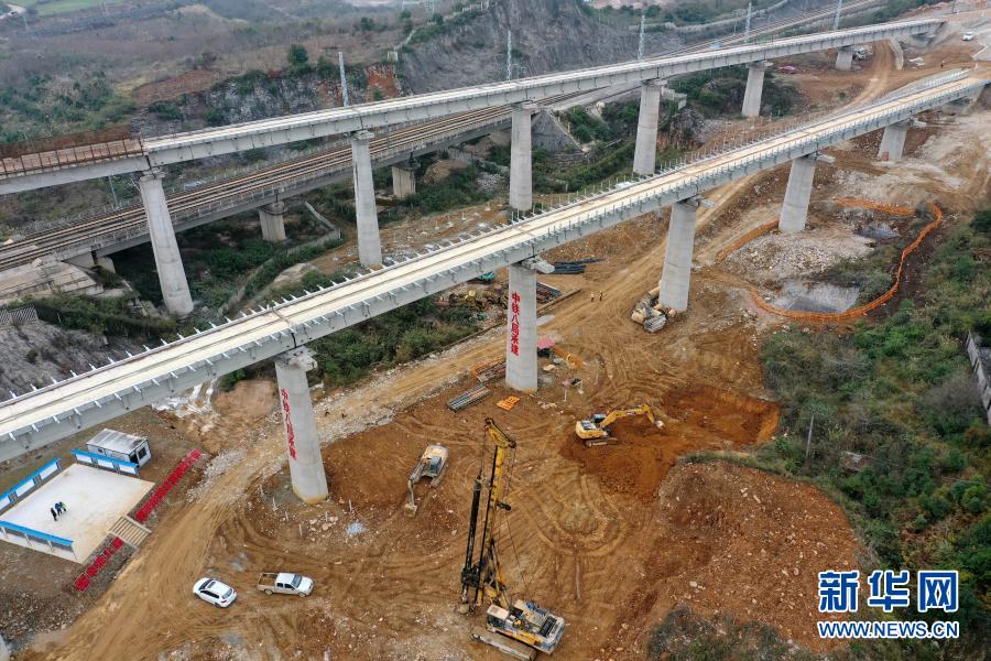 近日,由中铁八局承建的贵(贵阳)南(南宁)高铁引入贵阳枢纽工程建设有序推进,桥墩桩基等线下工程正加紧施工。贵南高铁设计时速350千米,是我国“八纵八横”高速铁路主通道包头至海口通道的重要组成部分。