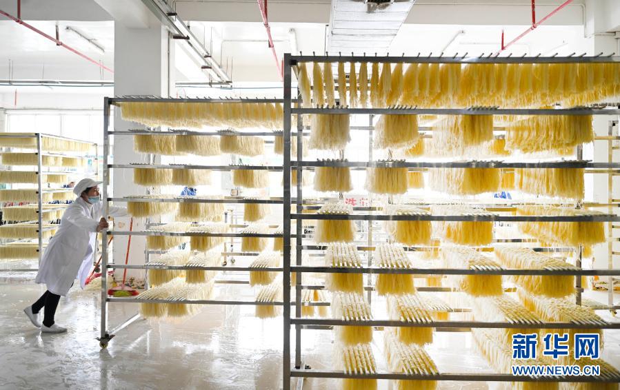 12月18日,在广西柳州螺蛳粉产业园一家螺蛳粉企业,工人在米粉车间里忙碌。