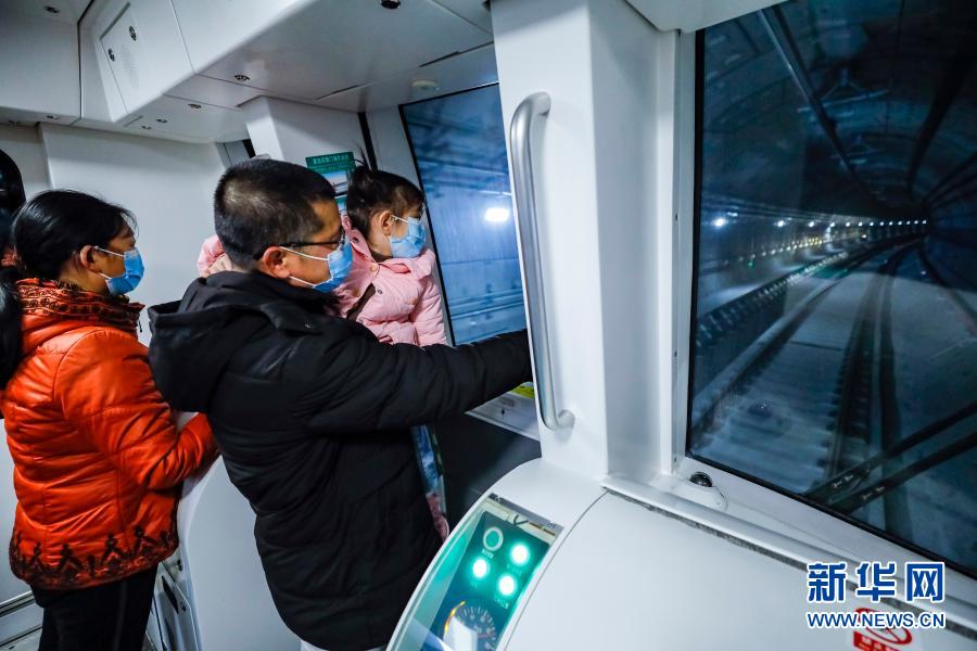 12月18日,在成都轨道交通9号线无人驾驶列车的“开放式”驾驶室,一名小女孩由外公外婆带着观看平日难得一见的地铁线路内部情景。小女孩的父亲覃阳是成都轨道交通的一名技术人员,他特意让父母带着孩子来体验新开通的地铁。