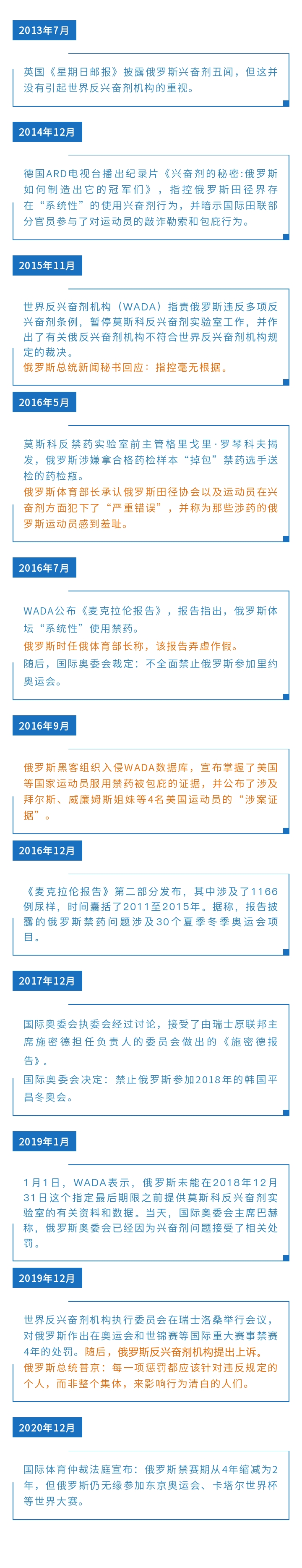 北京时间12月17日23时,国际体育仲裁法庭(CAS)宣布,认定俄罗斯反兴奋剂中心违规,并对俄罗斯反兴奋剂中心(RUSADA)处以为期两年的一系列处罚。2020年12月17日至2022年12月16日的两年间,俄罗斯将不得参加包括东京奥运会及各项目世界锦标赛在内的重大国际体育赛事。