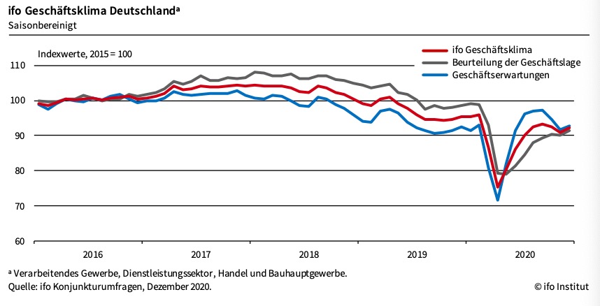 具体来看,12月制造业指数创下今年1月以来的最高值主要可以归功于化工和机械制造领域的积极复苏态势影响,受访企业对未来数月的发展充满信心;服务业指数虽然只有轻微回升,但物流运输、房地产等领域的企业对当前经营状况的满意程度有所增加,旅游相关和文化领域的企业则依旧在疫情重创下萎靡不振;贸易指数的上涨离不开批发商境况的好转,而零售业在德国全境实施“硬性封锁”前就已经透露出对未来的悲观情绪。