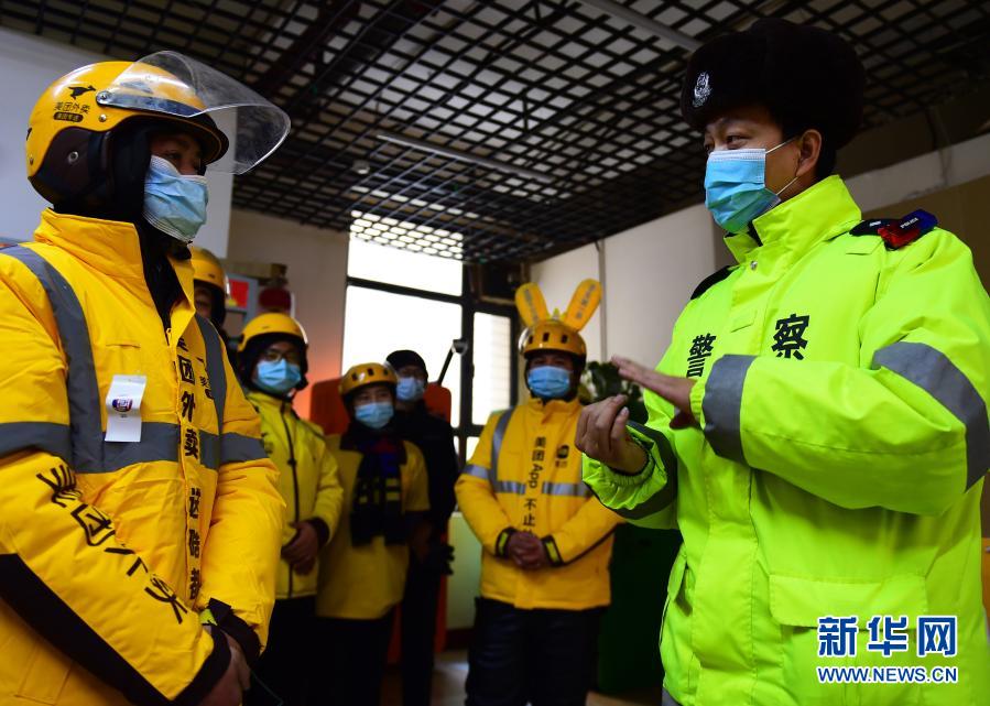 12月18日,乌鲁木齐市公安局交警支队沙依巴克区大队西北路中队民警赵国治(右一)为外卖骑手讲解骑行注意事项。