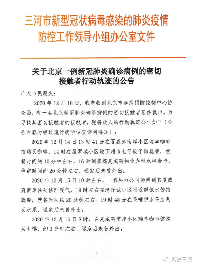 河北省三河市公告北京一例新冠肺炎确诊病例的密接者行动轨迹