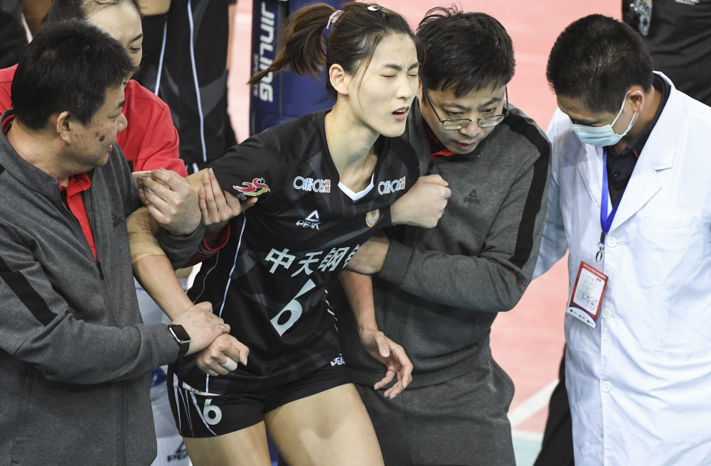 在17日晚进行的2020-2021赛季中国女子排球超级联赛总决赛第二场比赛中,刁琳宇在防守落地时踩到了天津队李盈莹的脚上,摔倒在地。