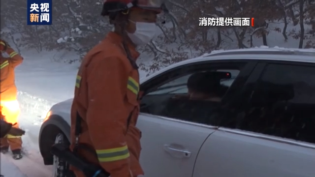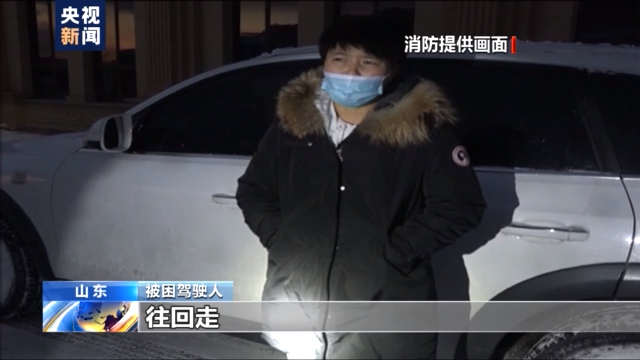 山东威海:暴雪天女子驾车被困山路 消防紧急救助
