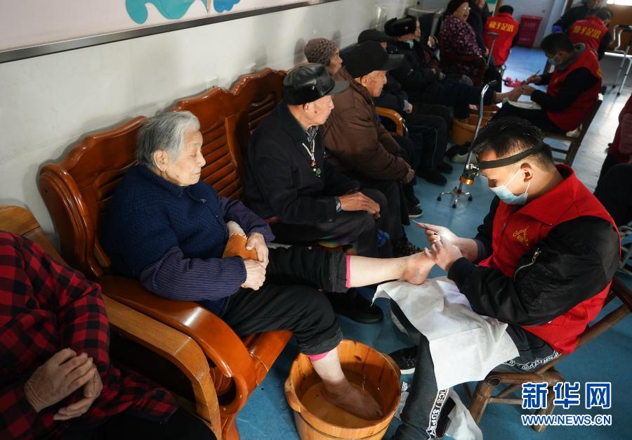 12月19日,在常州市武进区夕阳红康乐中心,志愿者在给老人修脚。