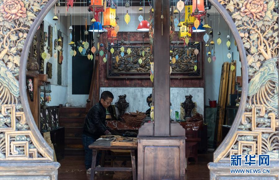 12月17日,在云南省丽江市束河古镇,何红生给木雕作品上色。新华社记者李梦馨摄