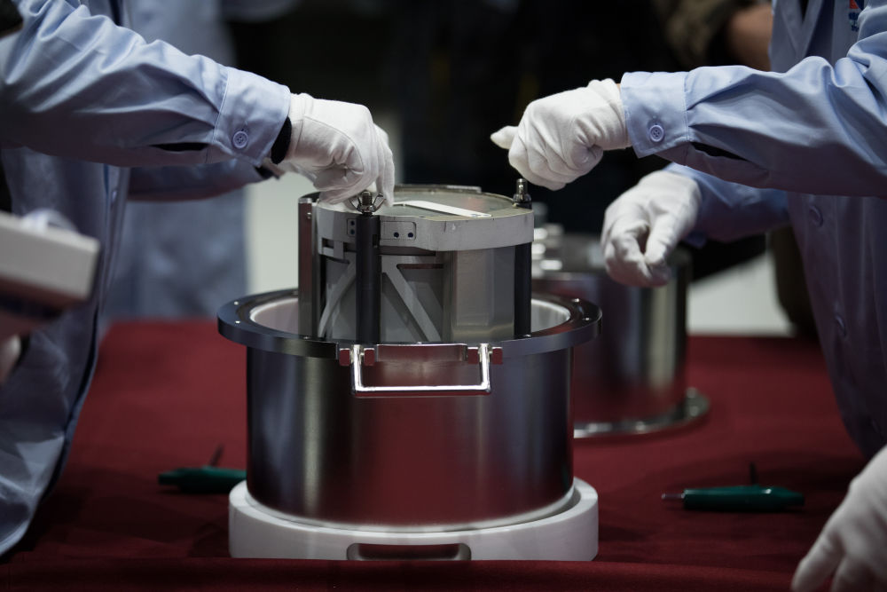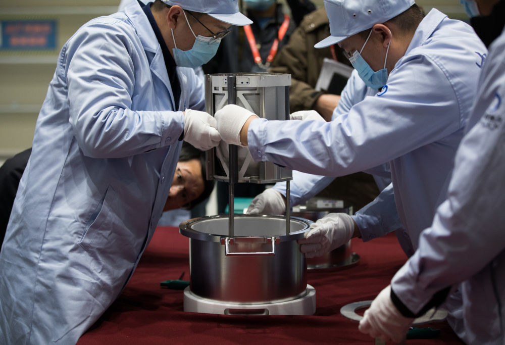 12月17日,在中国航天科技集团五院,科研人员打开嫦娥五号返回器舱门,取出装有月球样品的容器并进行称重。