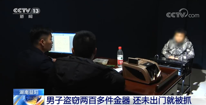湖南益阳市公安局资阳分局刑侦大队民警 陈鹏:犯罪嫌疑人进去以后,首先来到收银台,找到一串钥匙,每个柜台去试,最后打开了7个柜台。犯罪嫌疑人总共盗窃了220件金器,合计重量有1200余克,60万元左右。