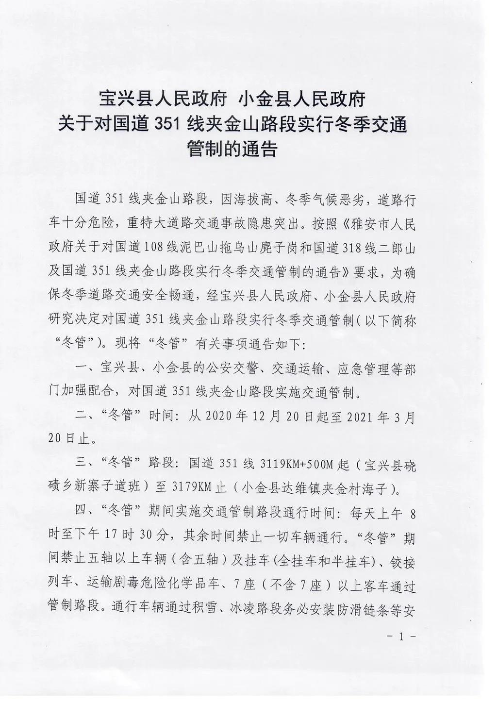 由于G351线夹金山路段海拔高,冬季气候恶劣,道路行车十分危险,重特大道路交通事故隐患突出,12月20日起,四川将对国道351线夹金山路段实行冬季交通管制(以下简称“冬管”)。