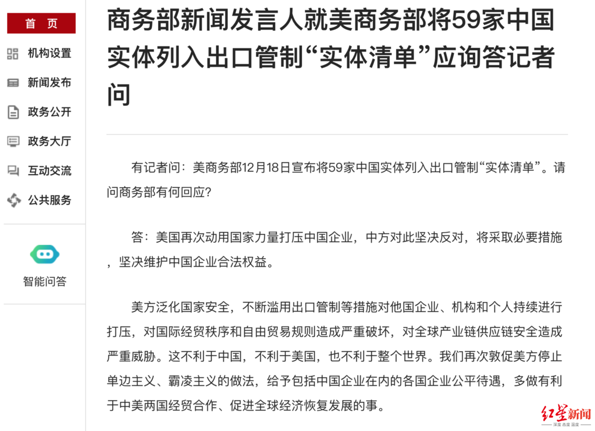 12月19日,据商务部官网消息,商务部新闻发言人就美商务部将59家中国实体列入出口管制“实体清单”应询答记者问: