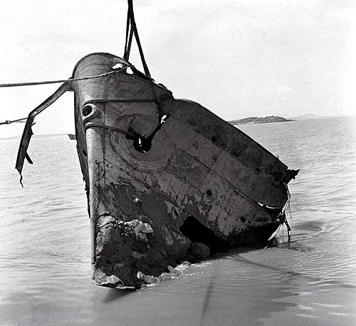 △ 被吊起的“阿波丸”号沉船船首部分