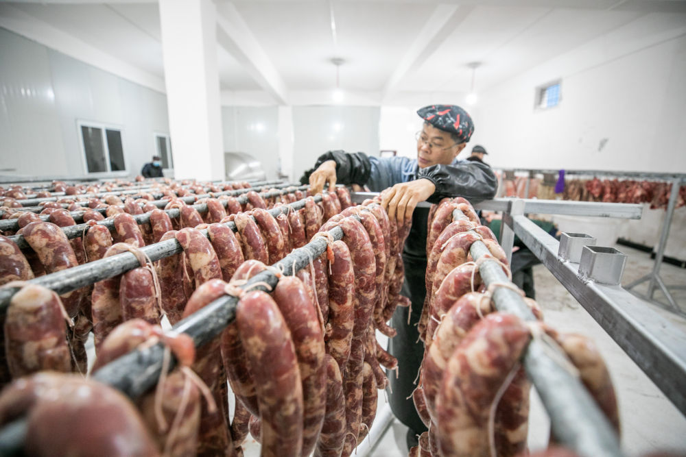 ↑12月18日,贵州省毕节市纳雍县坪箐村村民在整理灌制好的香肠。