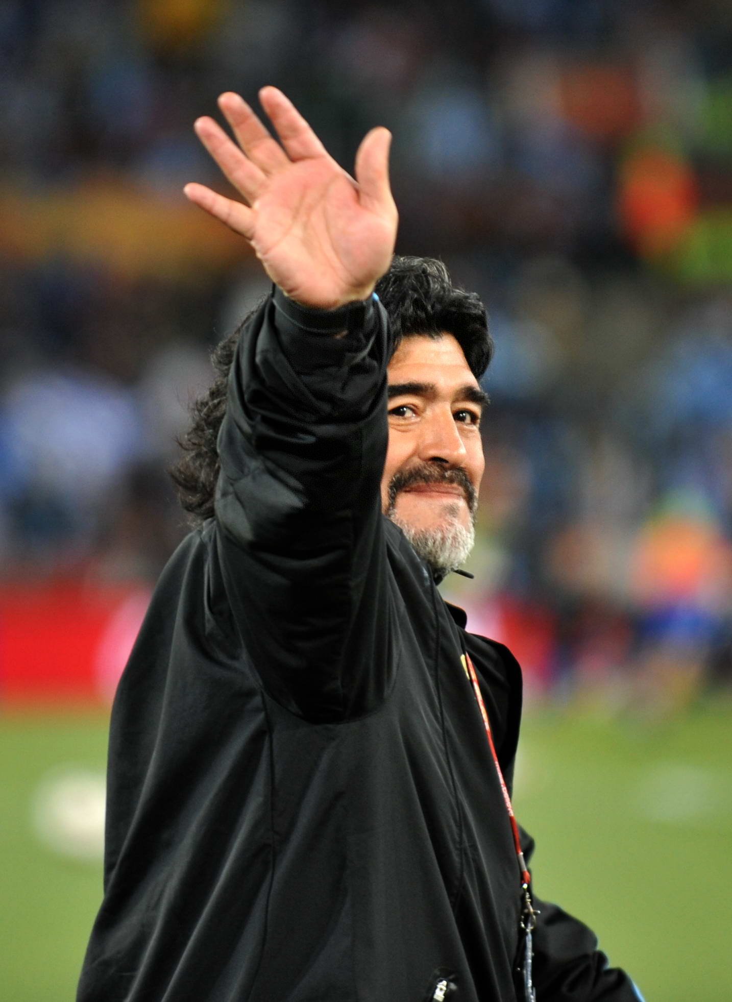 这是2010年6月22日,阿根廷主帅马拉多纳在南非波罗瓜尼举行的世界杯足球赛B组比赛开赛前挥手致意。新华社记者 徐速绘 摄