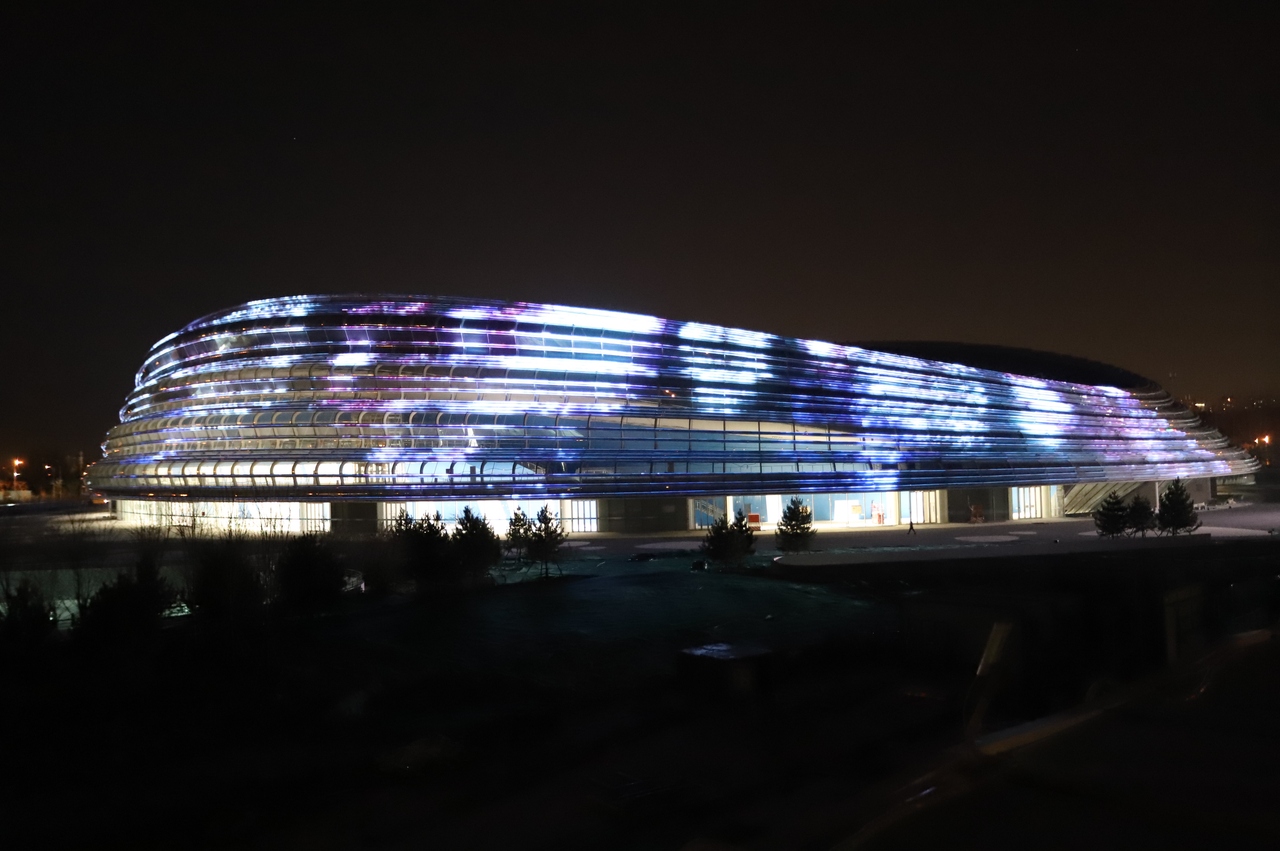 这是12月15日,国家速滑馆“冰丝带”进行场馆外立面泛光照明调试。新华社记者 张骁 摄
