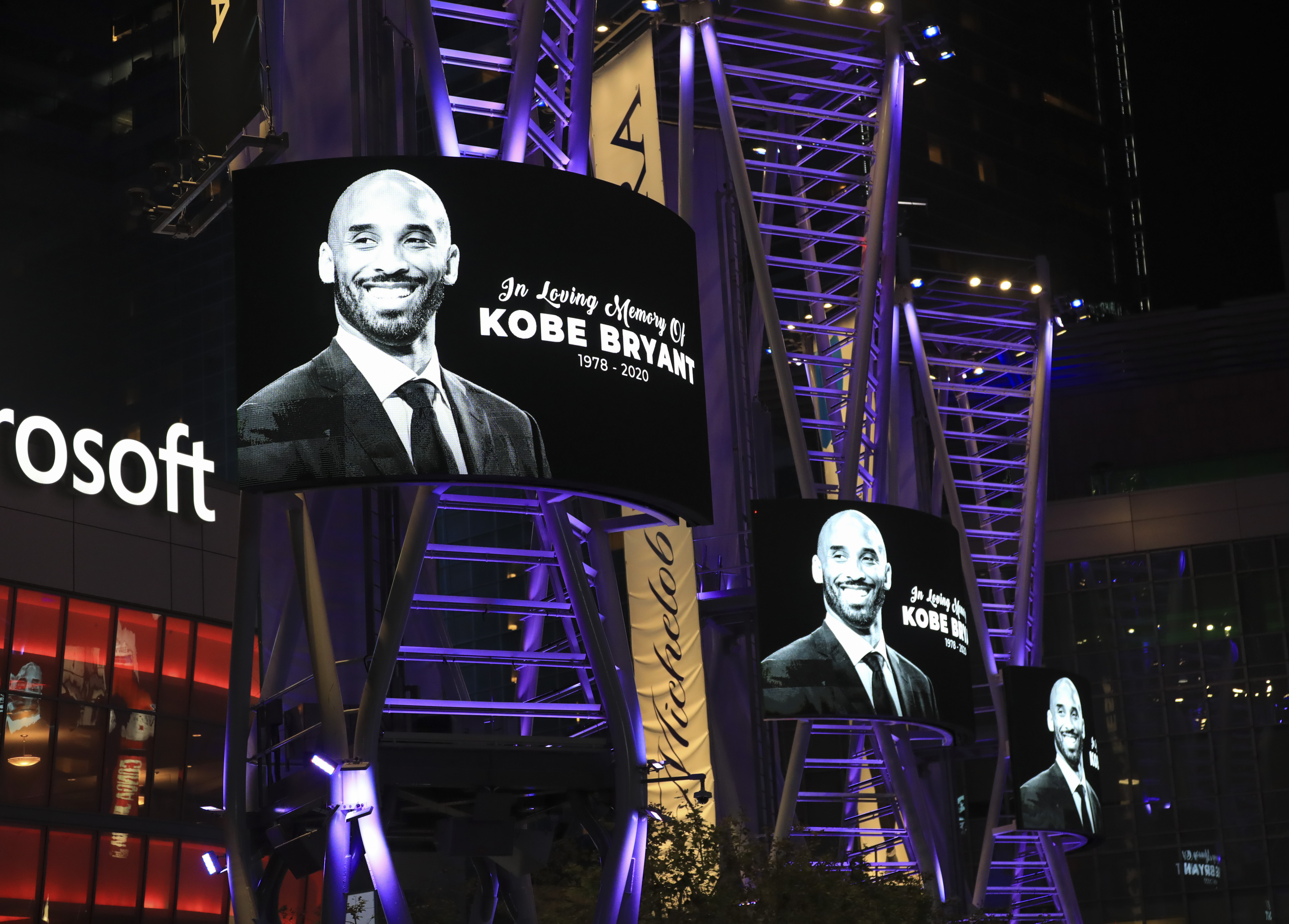 1月26日,在洛杉矶湖人队主场斯台普斯中心外,显示屏上展示出科比生前照片。新华社记者 李颖 摄