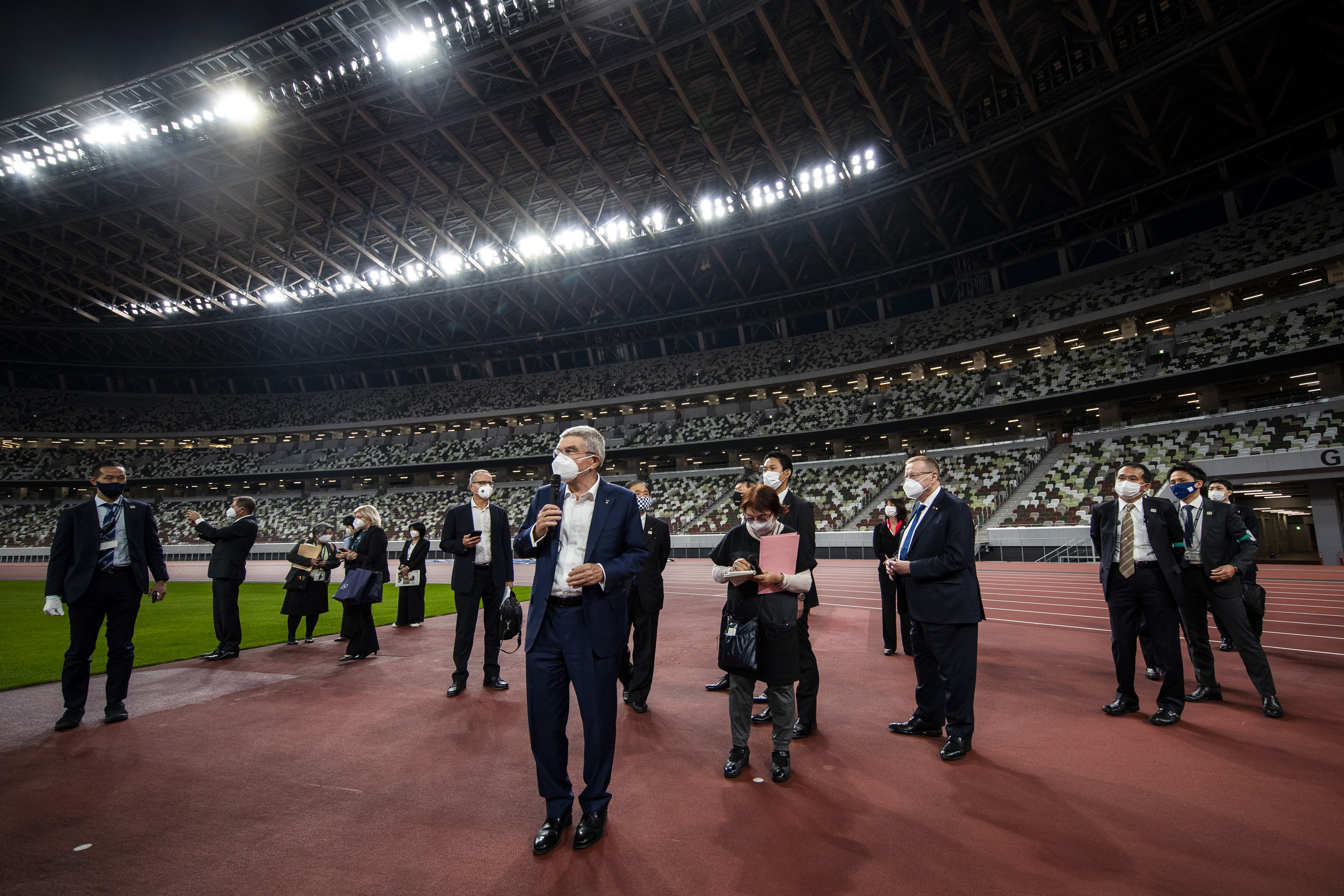 11月17日,国际奥委会主席巴赫(左前)在参观新国立竞技场时回答媒体记者提问。新华社/POOL/贝赫鲁兹·迈赫里