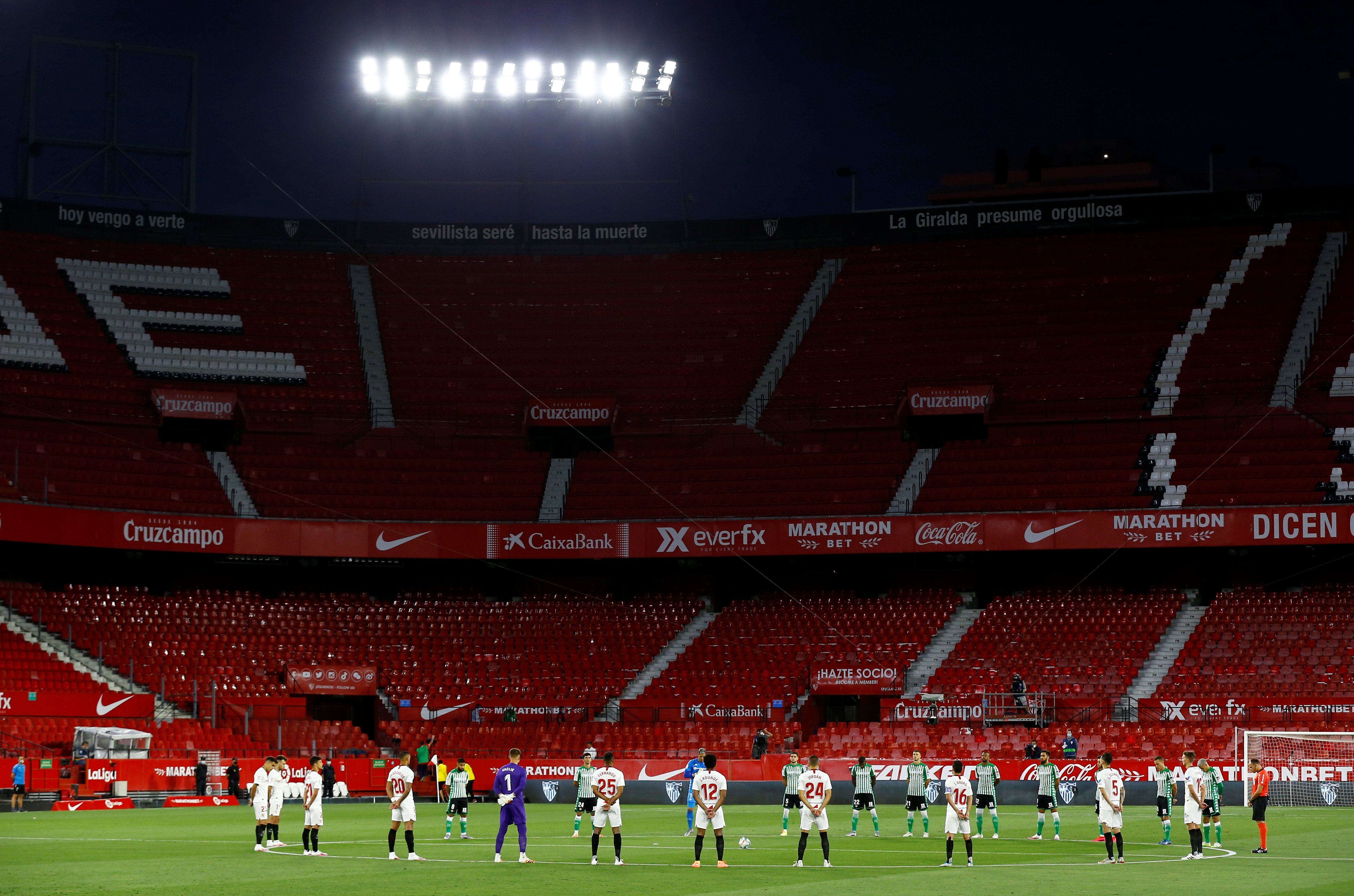 6月11日,西甲球员在比赛开始前默哀,悼念新冠肺炎的病逝者。新华社/路透