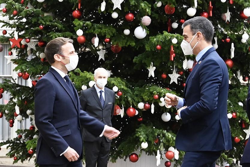 12月14日,法国总统马克龙(左)在位于巴黎的总统府爱丽舍宫与西班牙首相桑切斯会面。(新华社发,博尔哈·德拉贝亚卡萨摄)