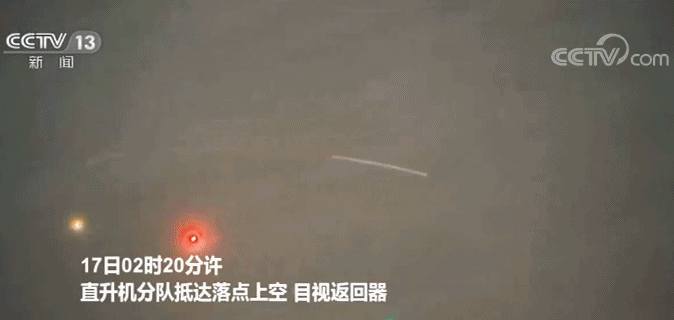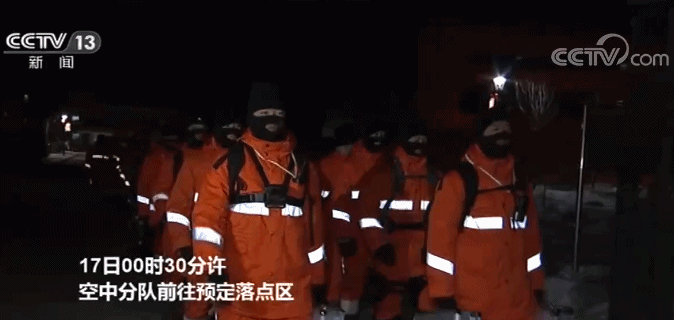 总台央视记者 王刚:现在是17日零点三十分,我们接到了北京中心的第一次落点预报,所以现在我跟随我们的直升机分队的搜救队员一起登机,前往指定的空域。