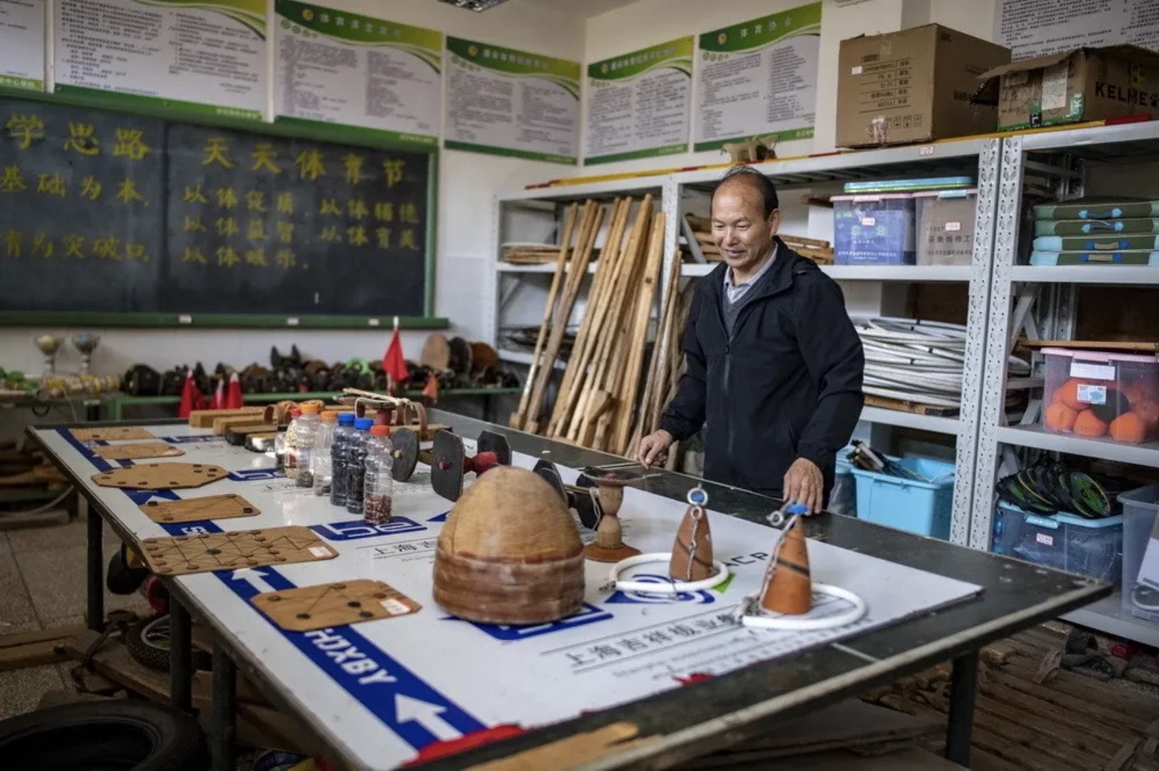 长长的板鞋,是毕首金制作的第一种教具。1984年,他刚刚来到白汉场村执教时,学校资金十分匮乏,体育课的全部家当,只有几对断把的乒乓球板和一个漏气的皮球。学生们对体育没有兴趣,最爱的是玩泥巴和掏鸟窝。于是把旧课桌的木板进行改装。很快2人款、4人款的板鞋,在校园风靡,等到推出16人款时,就需要在操场两头排起长长的队伍。看到孩子们挥汗如雨,对体育重燃兴趣,毕首金将家和办公室都成了手工作坊。