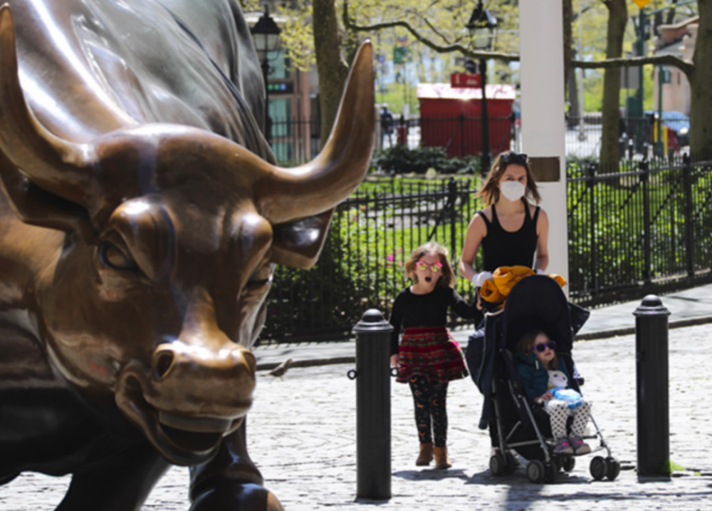 2020年4月28日,行人从美国纽约华尔街铜牛旁走过。图|新华社
