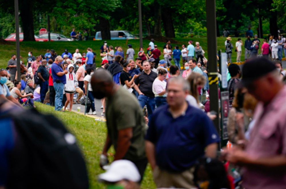 2020年6月18日,人们在美国肯塔基州法兰克福排队等待就业中心开门。