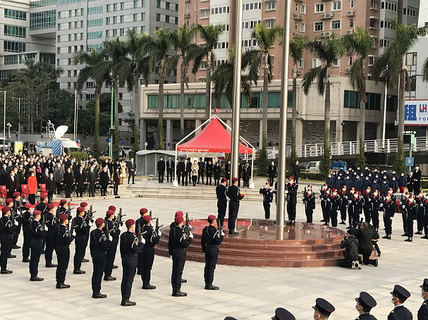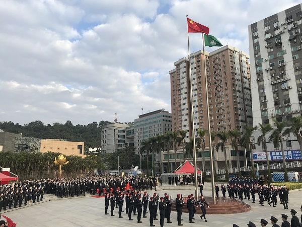 上午8时整,澳门纪律部队仪仗队迈着整齐的步伐,护送中华人民共和国国旗和澳门特区区旗,来到金莲花广场的旗杆下。