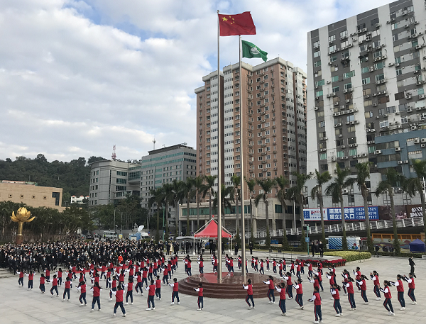 随着雄壮的《义勇军进行曲》响起,在濠江中学50名学生的领唱下,全场肃立高唱国歌,五星红旗和澳门特区区旗在众人的注视中,冉冉升起。