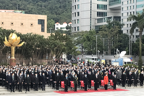 12月20日上午,澳门特区政府在金莲花广场举行了隆重的升旗仪式,庆祝澳门回归祖国21周年。澳门特区政府、中央驻澳机构和社会各界代表等约510人,以及众多市民和游客来到金莲花广场共同观礼,庆祝回归纪念日。