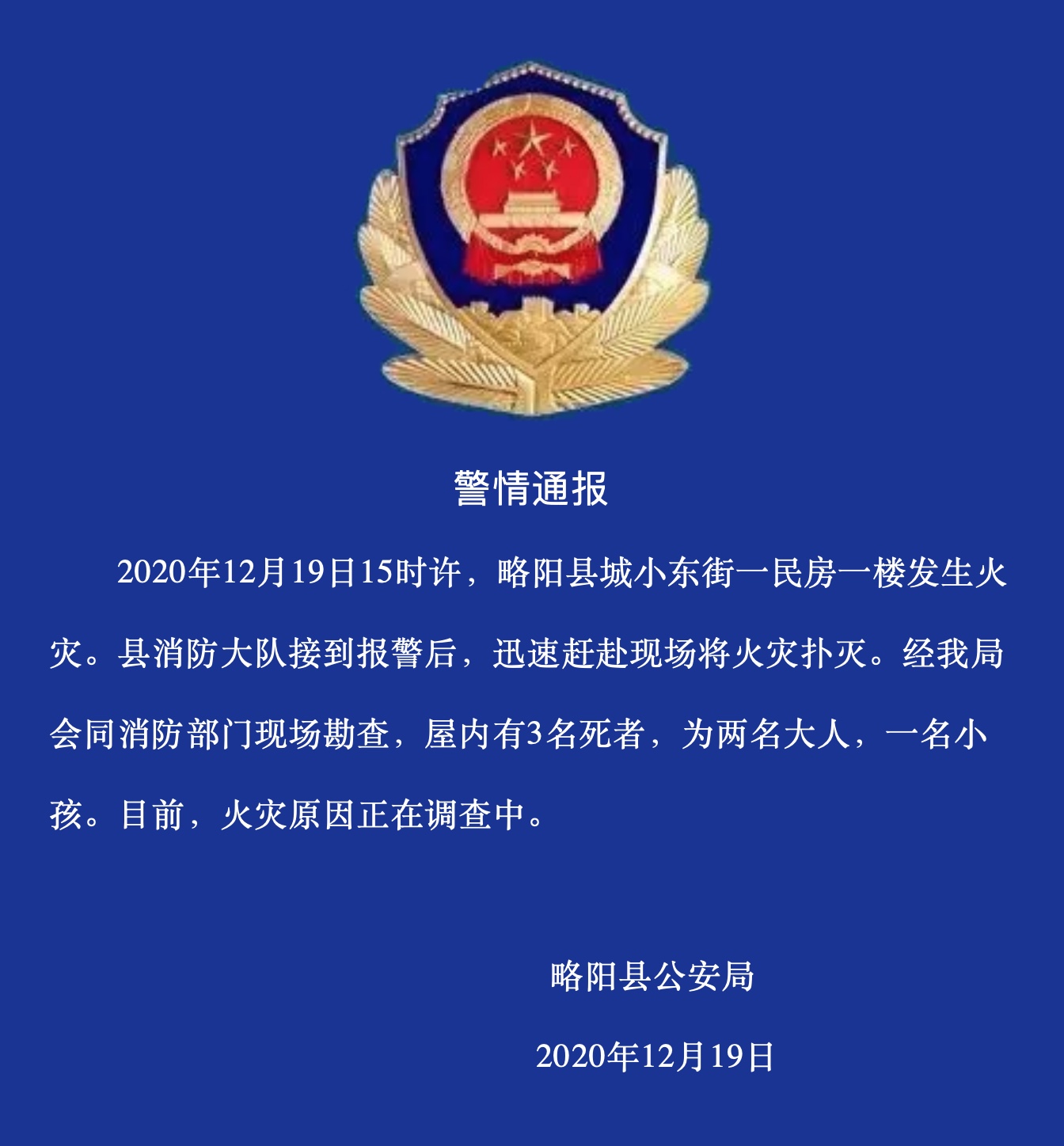 当晚,汉中市略阳县公安局官方微信“略阳公安”发布警情通报:经略阳公安局会同消防部门现场勘查,屋内有3名死者,为两名大人,一名小孩。目前,火灾原因正在调查中。(总台央视记者 陈武 吴成轩 郭升)