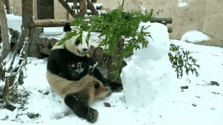 饱餐一顿之后,大熊猫“如意”对这个新玩具雪人仍然兴致不减。我踢,我顶,我推,终于将雪人完全击倒。获胜的大熊猫“如意”非常开心,继续展示了自己侧滚翻和前滚翻的技能,憨态可掬的样子让人忍俊不禁。
