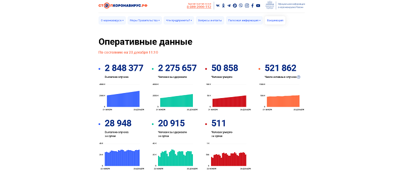 据俄罗斯新冠病毒防疫官网发布的信息,截至当地时间12月20日11时10分,过去24小时俄罗斯新增新冠肺炎确诊病例28948例,累计确诊2848377例;新增治愈病例20915例,累计治愈2275657例;新增死亡病例511例,累计死亡50858例。